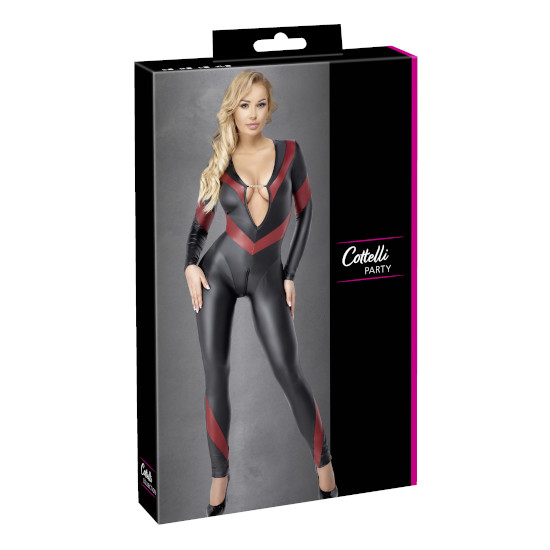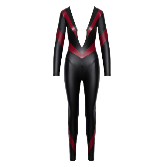 Fato inteiro de manga comprida em look matte preto, com detalhes vermelho.