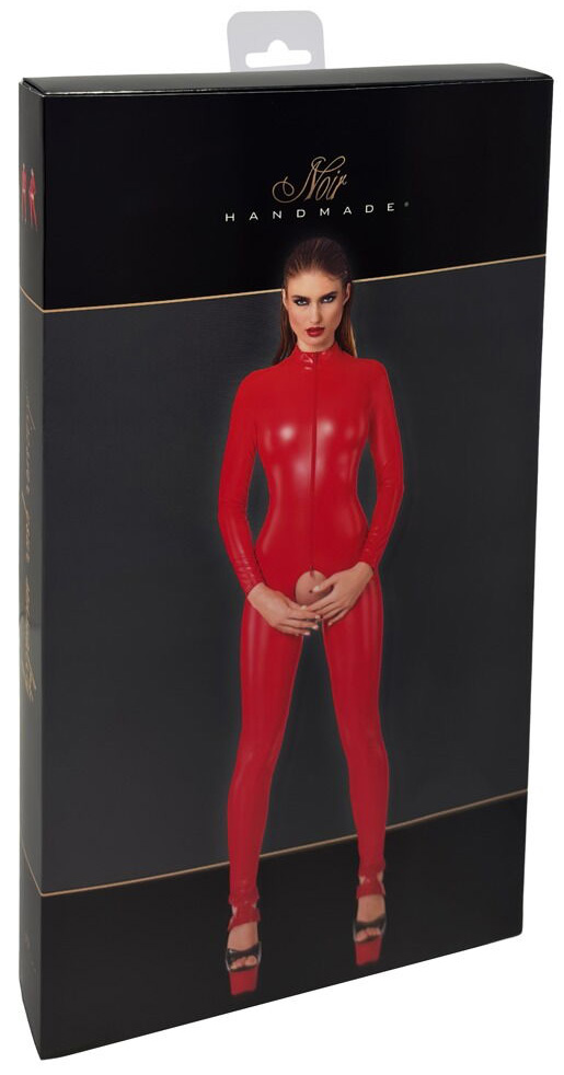 O exclusivo macacão sem fundo da Noir é feito num moderno look powerwetlook vermelho vibrante. Tem um estilo que realça as curvas e tem uma pequena gola alta, mangas compridas e pernas compridas.