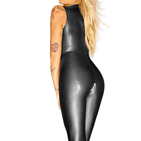 Fato inteiro justo sem mangas e gola alta feito em tecido extensível acetinado “efeito molhado”.