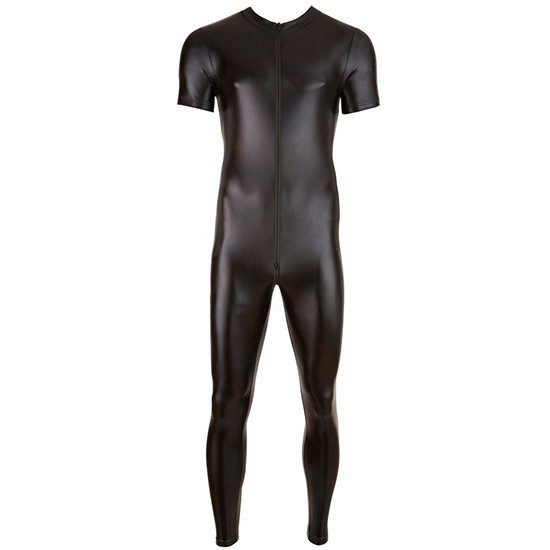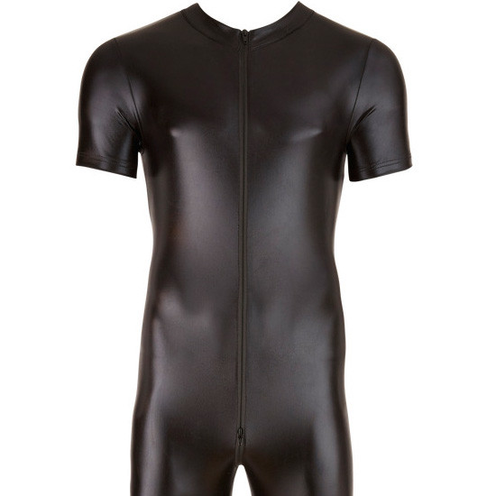 Fato inteiro em tecido muito extensível preto com acabamento acetinado “efeito molhado”.