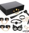 O kit é composto por oito acessórios essenciais no mundo do BDSM, todos com detalhes dourados para um toque mais elegante e atraente.
