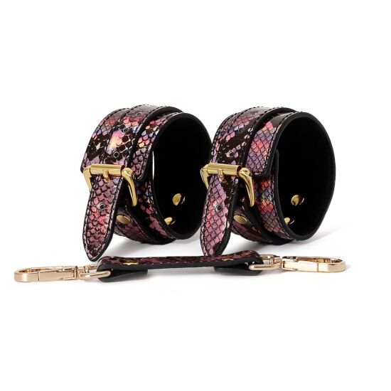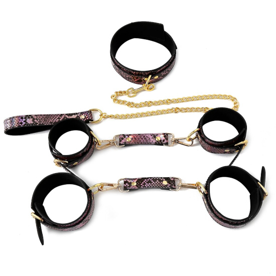 Este conjuntos de 3 pelas réptil BDSM ouro/rosa parece incrível, ele vem com uma coleira com trela, algemas de punhos e de tornozelo e são obrigatórios para sua coleção de BDSM.