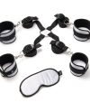 As 4 algemas macias com velcro facilitam a contenção de todo o corpo, enquanto a máscara suave para os olhos incluída no kit restringe a visão do seu amante para uma submissão total.