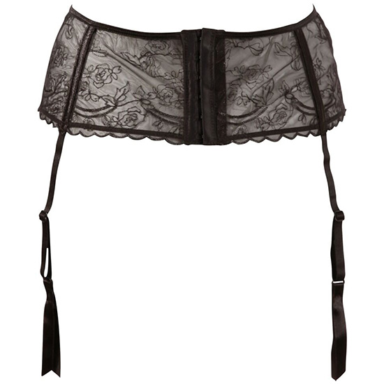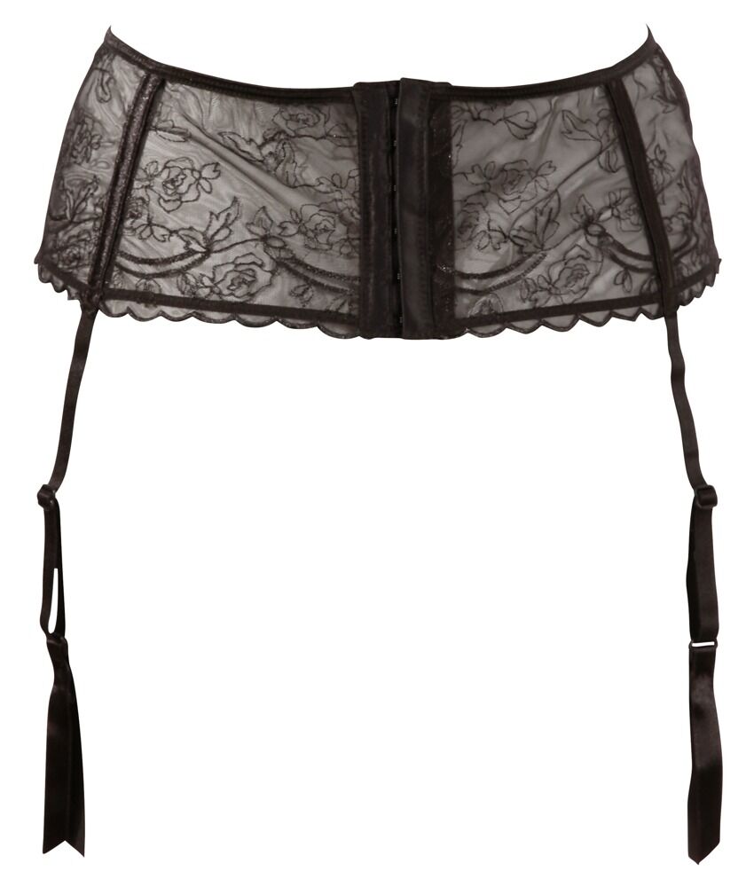 Cinto suspensor com quatro tiras ajustáveis e fecho de gancho com duas filas de ganchos.