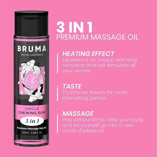 O Óleo de Massagem Premium Heat Effect com sabor de chiclete da marca BRUMA é uma verdadeira joia no mundo do bem-estar e da intimidade.