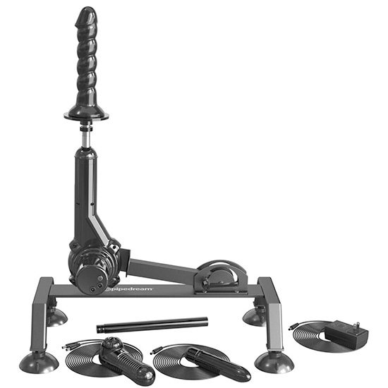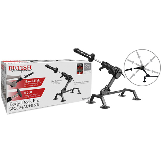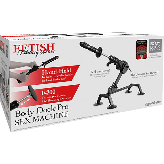 A máquina de sexo Body Dock Pro da Fetish Fantasy Series, alimentada pela rede elétrica, tem um tamanho compacto e estreito e vem também com um comando, um vibrador e um mini-vibrador.