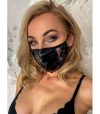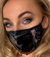 Esta máscara facial preta acetinada possui “efeito molhado” e inserções decorativas de renda em ambos os lados que são realmente atraentes.