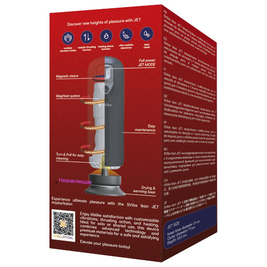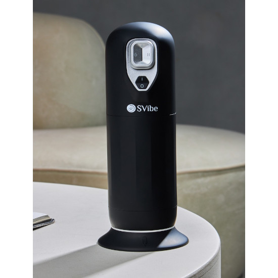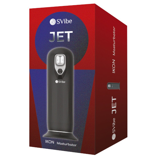 O masturbador JET IKON fácil de utilizar da SVibe tem um design discreto e fácil de segurar, com uma haste de aquecimento na tampa de proteção.
