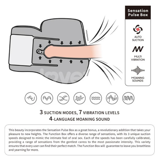 Com a integração de sons de gemidos realistas e 7 frequências de vibração, a Sensation Pulse Box vai ainda mais longe para garantir uma experiência verdadeiramente alucinante, evocando um prazer irresistível em cada encontro, respeitando a sua pele.
