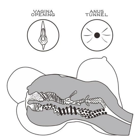 A inserção do ânus é muito mais estreita e possui inúmeras curvas.