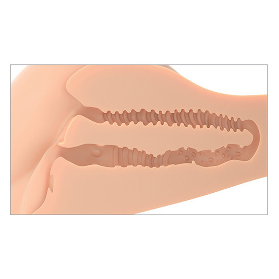 Ambos os canais de prazer apertados, mas flexíveis, possuem texturas elaboradas e diversas no interior para massagens intensas.