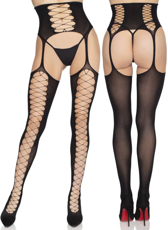 Estas meias-calças ousadas, com ligueiro incorporado, apresentam um acabamento preto transparente com detalhes marcantes de recortes e rede ao longo das pernas e da cintura.