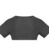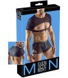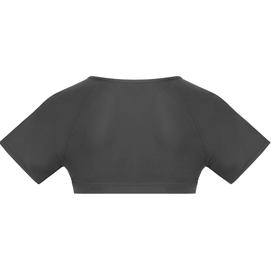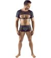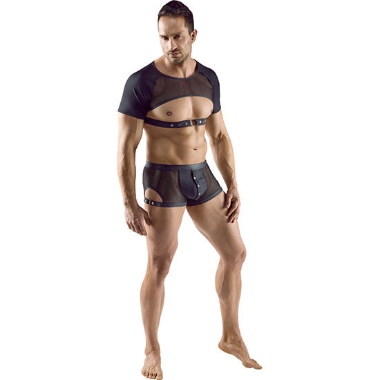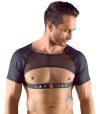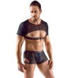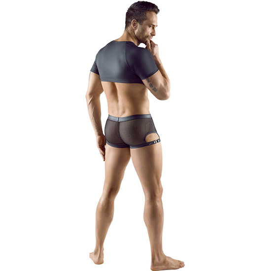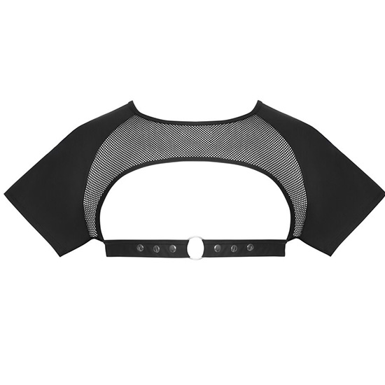 Peito aberto, top curto com manga curta em rede combinado com tecido acetinado preto.