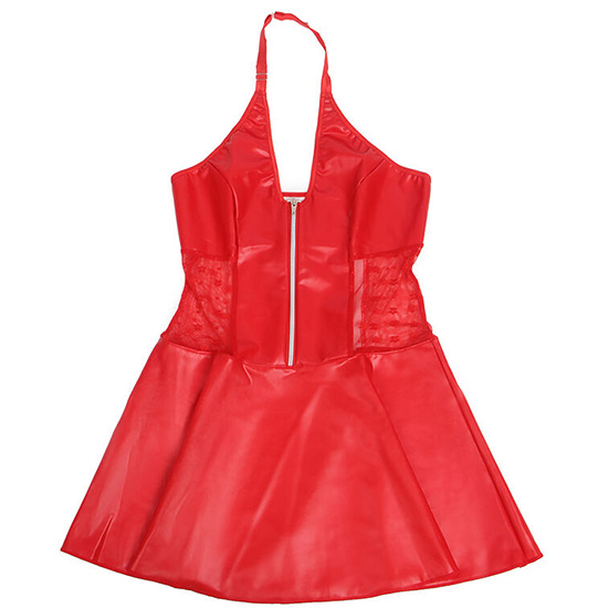 Este design combina renda floral delicada com efeito de couro marcante (couro PU) em vermelho vibrante, criando um contraste irresistível entre o romântico e o ousado. Seu decote halter emoldura os ombros e o pescoço com um toque de sofisticação, enquanto seu corte ajustado destaca a silhueta de forma sensual e poderosa.