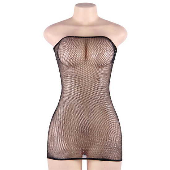 Mini-Vestido em rede preta super extensível, decorada com pedras strass brilhantes. Sem alças, ajusta-se à sua silhueta.
