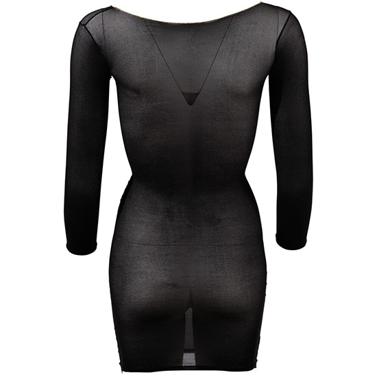 Apresenta um decote profundo na frente e nas costas e é realçado por uma costura dourada.