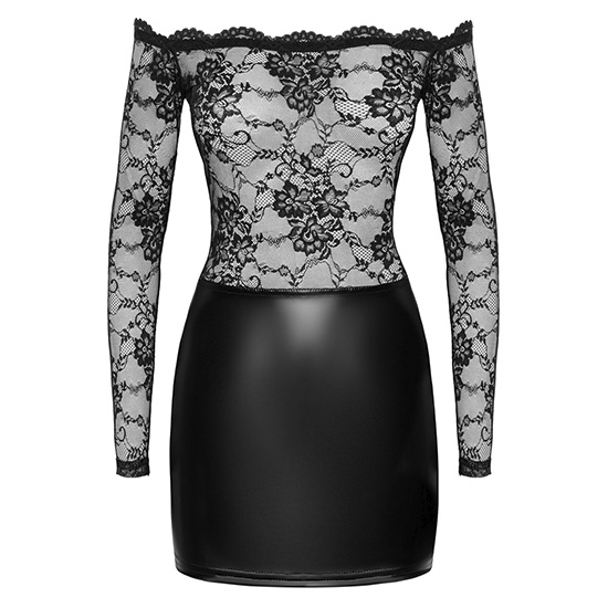 O mini-vestido preto da Noir tem mangas compridas e é feito com uma bonita renda (parte de cima) e tecido acetinado preto (parte da saia) – cai como uma segunda pele.