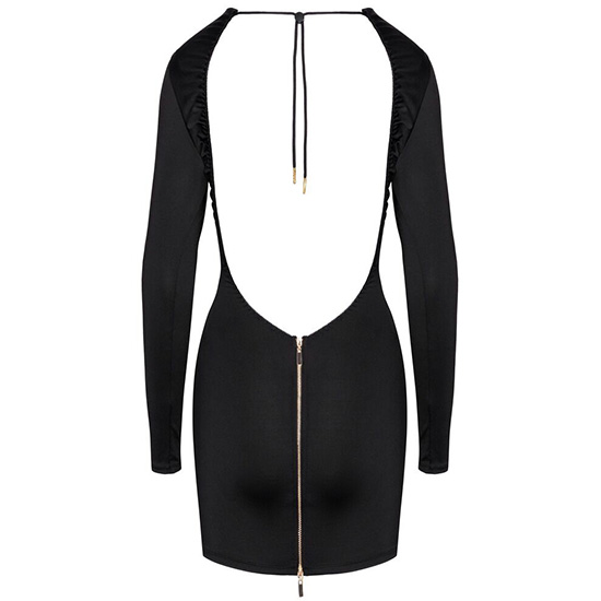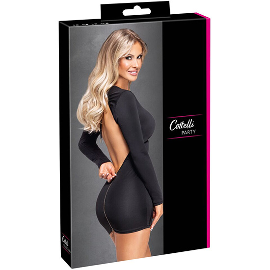 O vestido curto preto da Cottelli PARTY é justo e tem mangas compridas. Possui um recorte amplo e deslumbrante nas costas e uma tira ajustável atrás, abaixo do pescoço.