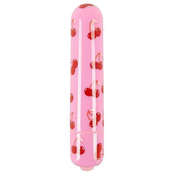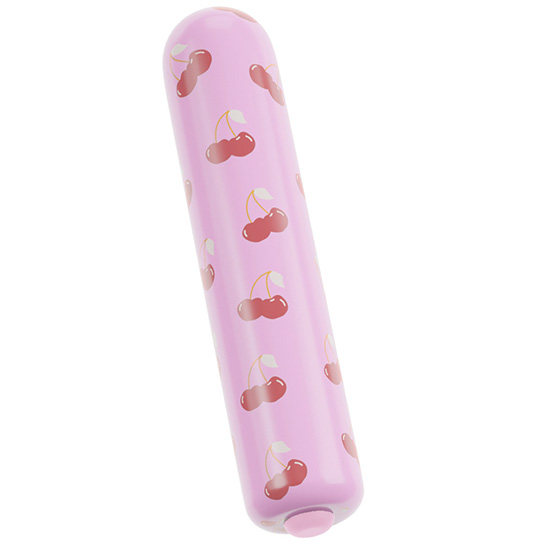 Divertido mini vibrador com design moderno rosa decorado com cerejas.