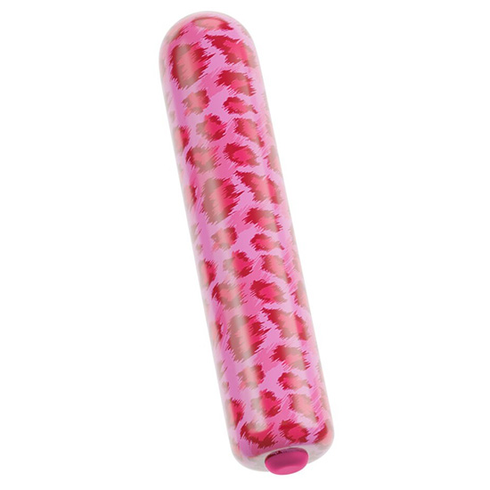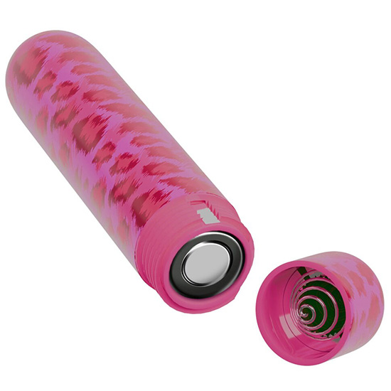 Divertido mini vibrador com design moderno rosa decorado com padrão leopardo.