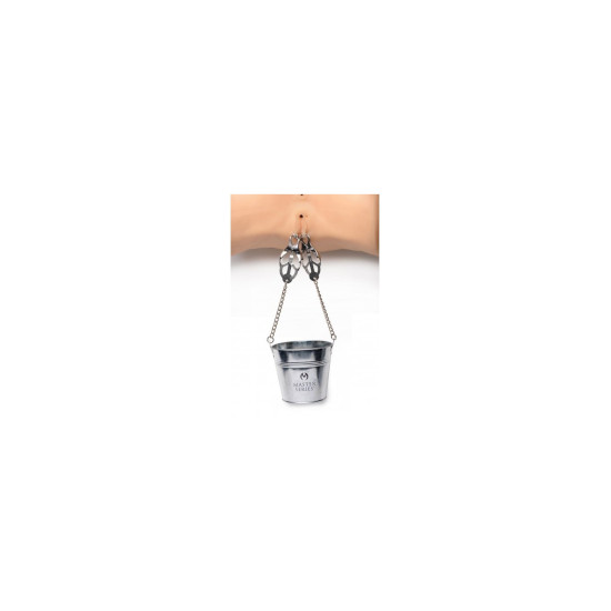 Conjunto de duas pinças unidas por uma corrente metálica que segura um balde metálico.