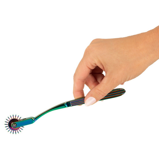 A roda é cravejada de pinos pequenos e muito afiados e pode ser usada em qualquer parte do corpo.