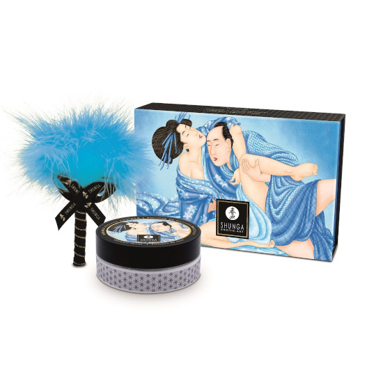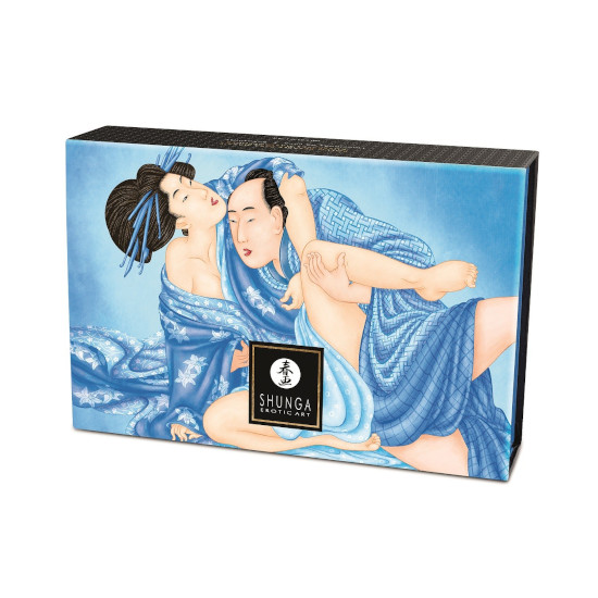 As atraentes caixas de presente incluem um espanador combinando com uma fita preta com o logotipo Shunga bordado em ouro.