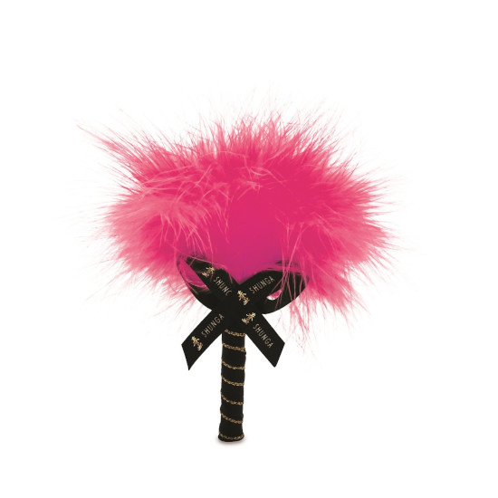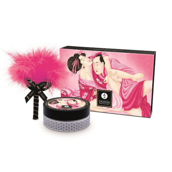 As atraentes caixas de presente incluem um espanador combinando com uma fita preta com o logotipo Shunga bordado em ouro.