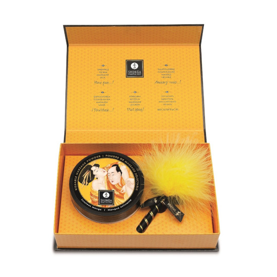 As atraentes caixas de presente incluem um espanador combinando com uma fita preta com o logotipo Shunga bordado em ouro.