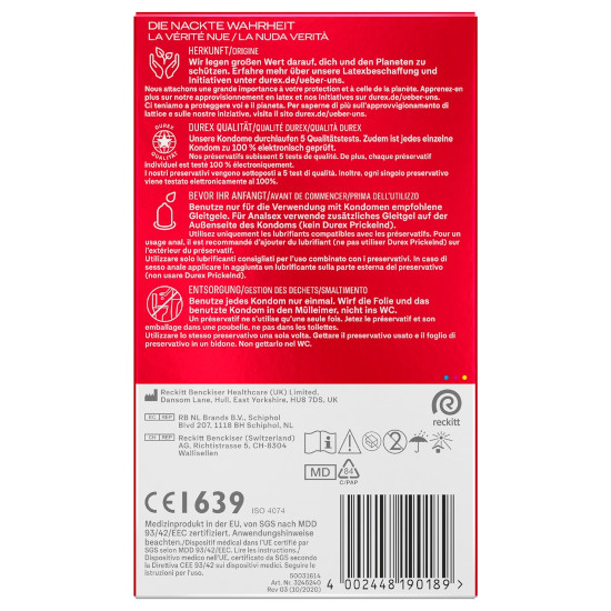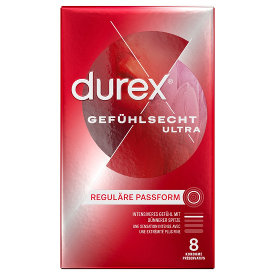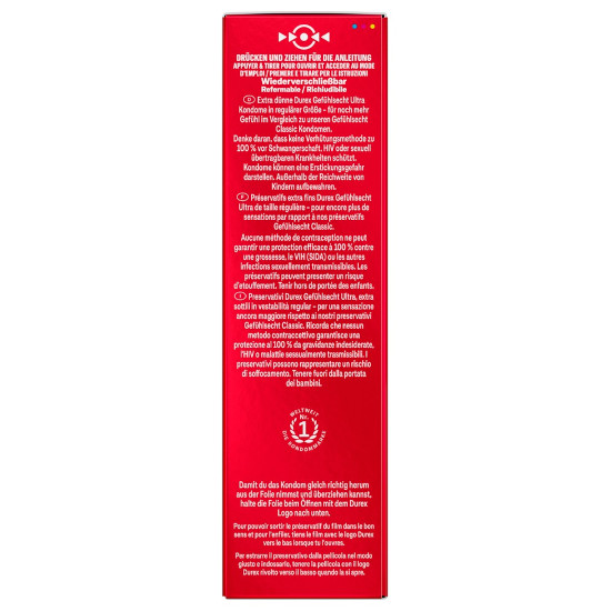 Preservativos transparentes Durex Gefühlsecht Ultra feitos de látex de borracha natural com material 20% mais fino na ponta para uma sensação especialmente intensa.