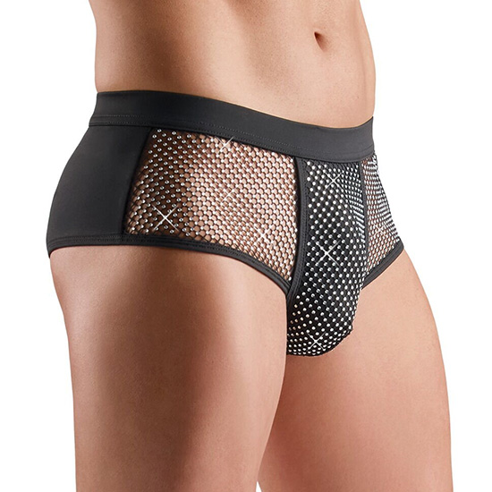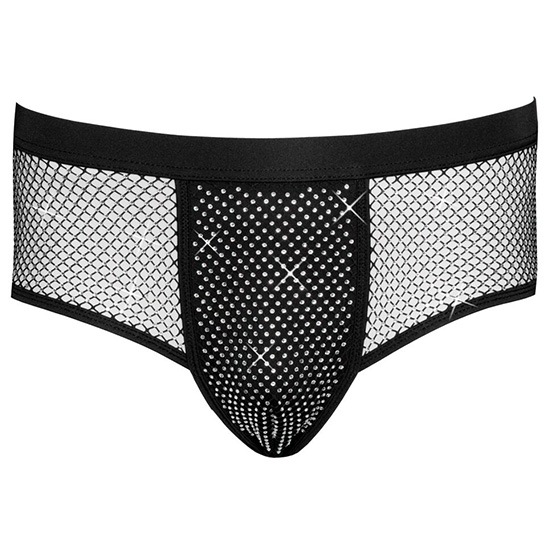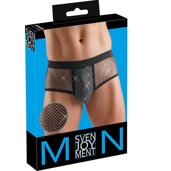 O slip modelador preto da Svenjoyment tem detalhes brilhantes na parte da frente: a parte frontal opaca e os detalhes em rede são cobertos com pedras brilhantes.
