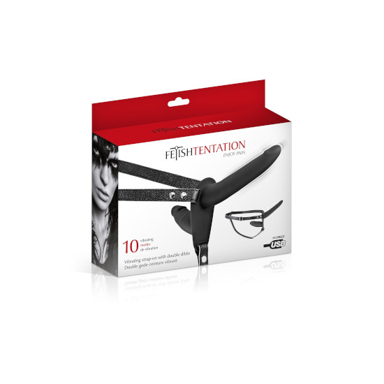Arnês duplo em silicone ajustável com vibração recarregável via cabo USB.