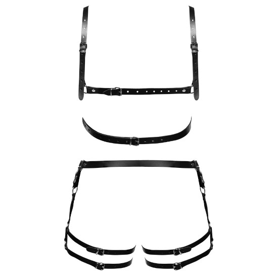 Conjunto robusto de arnês da ZADO feito de tiras de couro preto com detalhes em metal prateado.