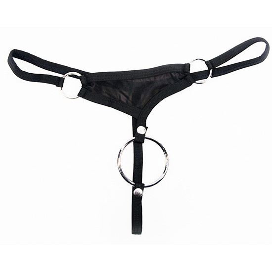 Tanga-string feito em microfibra preta extensível com um anel peniano de metal removível à frente.
