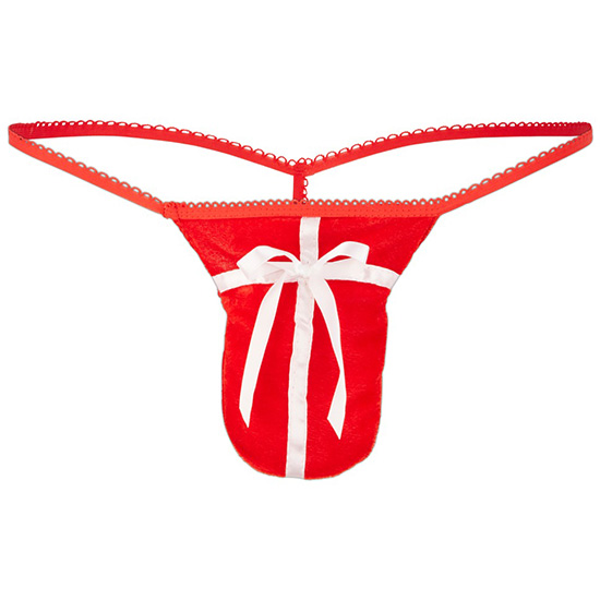 Surpreenda com esta original tanga-string extensível de veludo vermelho com detalhes brancos.