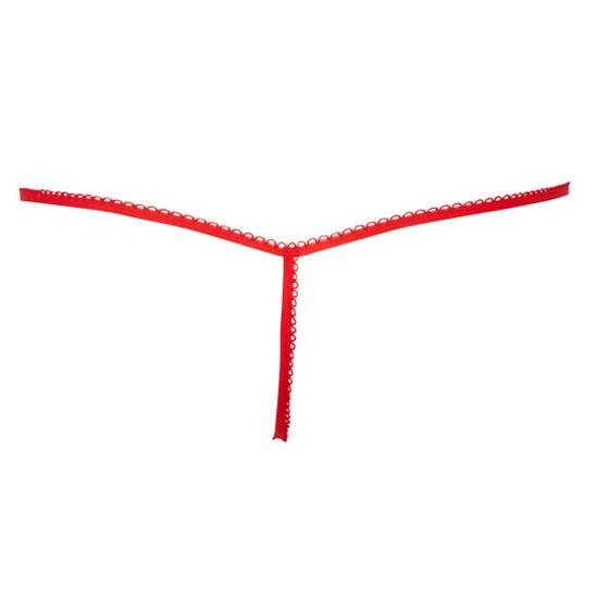 Tanga-string em tecido metalizado vermelho decorada com plumas brancas.