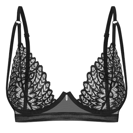 O sutiã preto com aros, Donarella da Obsessive, é feito de tule bordado delicado, mas elástico. As copas macias e elásticas aderem confortavelmente aos seios.