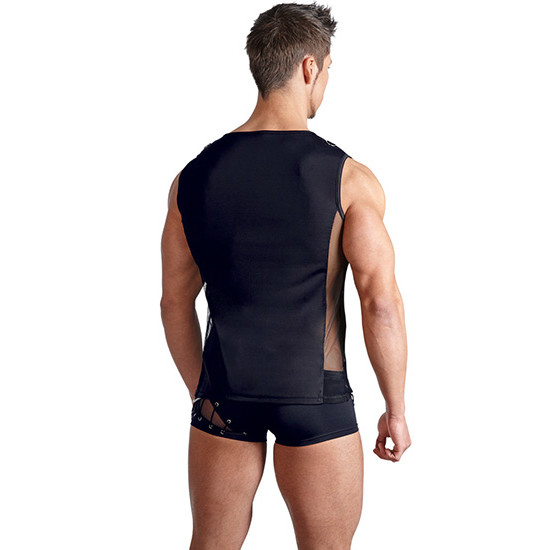 T-shirt sem mangas em tecido opaco preto combinado com rede transparente preta.