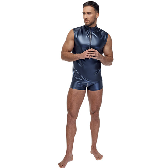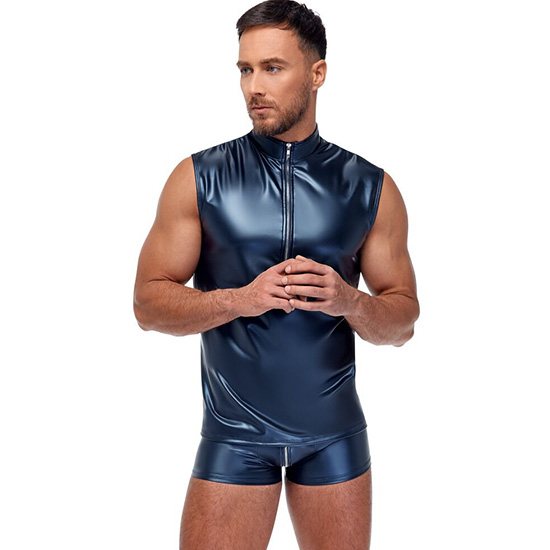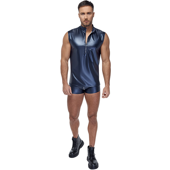 Camisola azul, sem mangas, num elegante visual metálico azul.