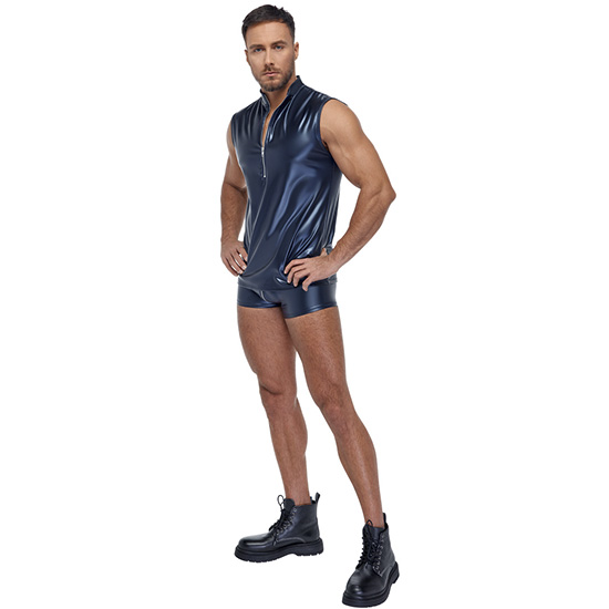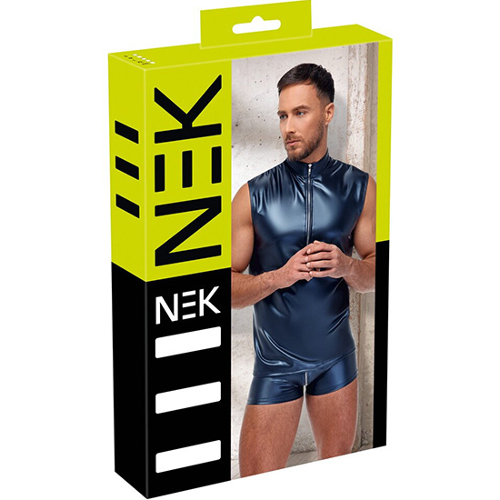 Camisola azul da NEK num elegante look metálico fosco. Sem mangas, justo e cintado. Com pequena gola alta e fecho prateado na frente.