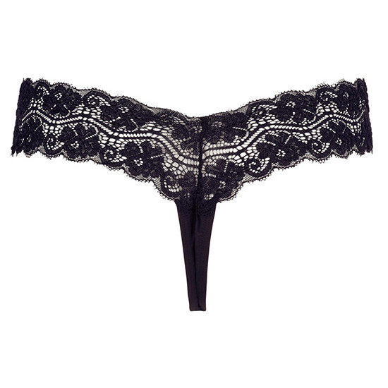 Tanga g-string em tecido extensível preto rendado unido por entre as pernas por 2 correntes de pérolas.