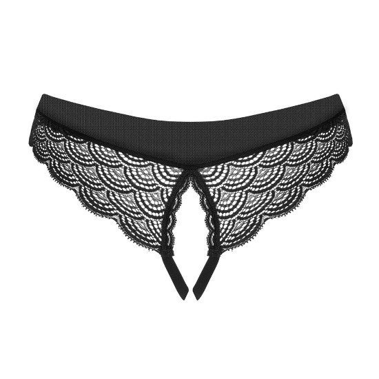Tanga preta aberta Chemeris da Obsessive confeccionada em renda elástica fina.