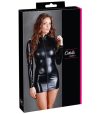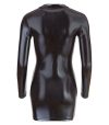 Vestido justo e de gola alta, confecionado em material preto acetinado.