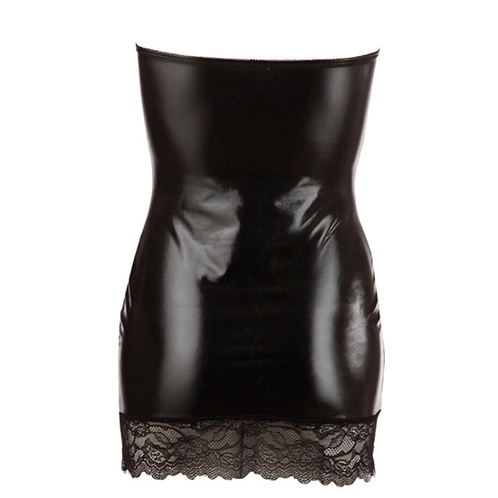 O tecido com efeito molhado e o corte justo realçam a sua silhueta, enquanto a renda no decote e na base acentua a sua feminilidade.