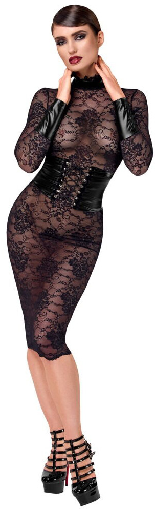 É confecionado inteiramente em renda preta com detalhes extravagantes em efeito molhado: punhos muito largos, uma bonita gola alta e um espartilho cosido na cintura que pode ser ajustado com o laço.