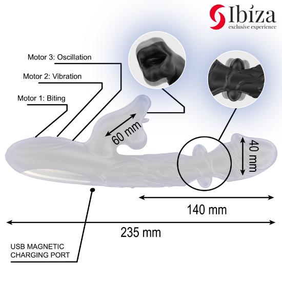 O Vibrador e Estimulador Clitoriano IBIZA com Efeito de Mordida e Rotação é uma opção ideal para quem busca estimulação intensa e variada.