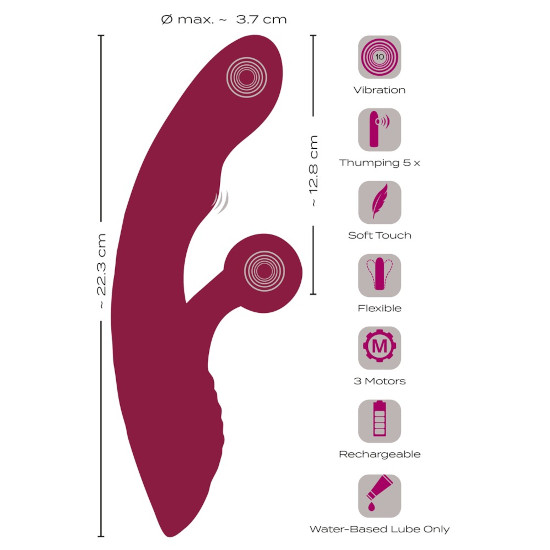 Os 3 motores silenciosos mas potentes fornecem energia fiável durante a estimulação dupla. As vibrações combinadas na ponta curva e no estimulador de bola clitoriana flexível estão em 10 modos.