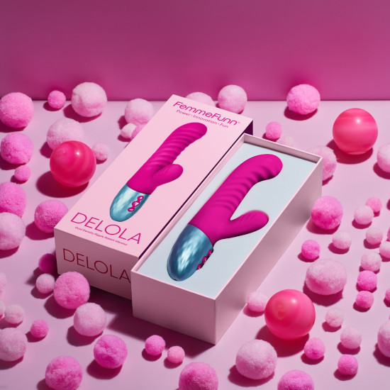 Delola, a nossa vibração de coelho de dupla densidade, gosta de provocar e agradar. Experiência de sensação em camadas com o seu núcleo de silicone firme, corpo de silicone líquido sedoso e textura ondulada.