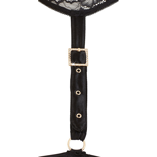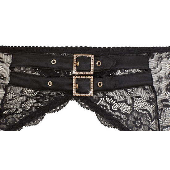 O sedutor cinto suspensório de renda tem duas fivelas de cinto que são cobertas de strass brilhante, 4 tiras suspensas ajustáveis e um gancho na parte de trás.