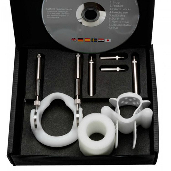 Entre o anel e o fixador, duas barras de metal dinâmicas aplicam uma tensão entre 600 e 1.500 gramas.